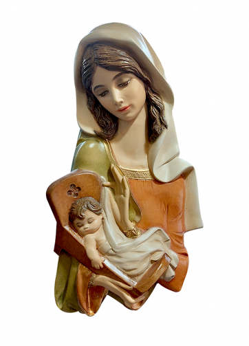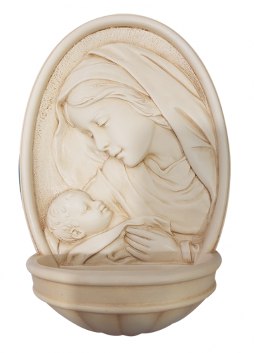 La pileta presenta un acabado meticuloso y un diseño artístico que resalta la pureza y la gracia. Cada detalle ha sido cuidadosamente elaborado para capturar la esencia misma de la Virgen María y el Niño Jesús, creando una pieza que inspira reverencia y conexión espiritual.